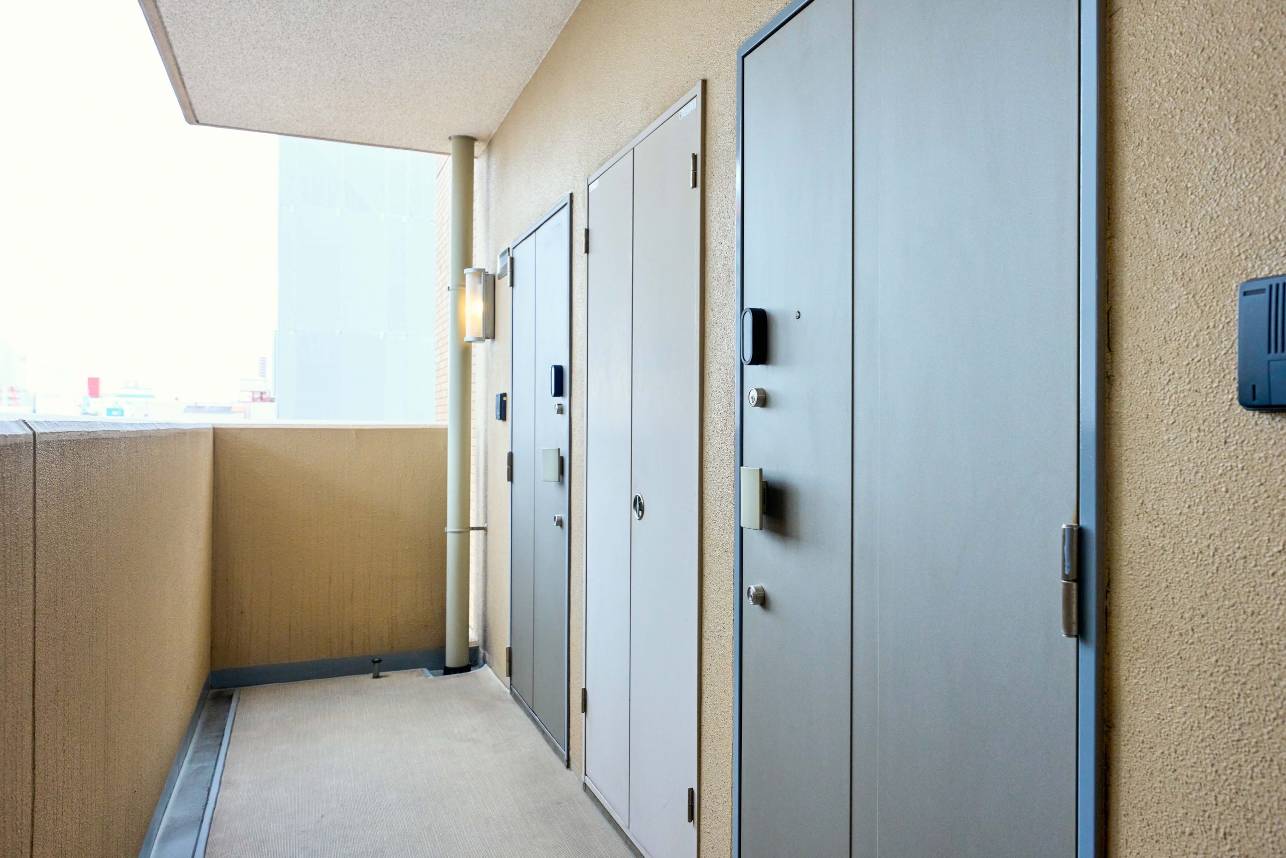 スマートロック付きのドアが並ぶ廊下